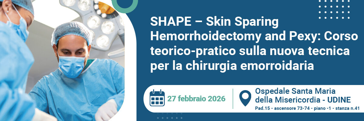 Il 27 febbraio 2026 si terrà presso l’Ospedale Santa Maria della Misericordia di Udine il corso teorico-pratico dedicato alla tecnica SHAPE – Skin Sparing Hemorrhoidectomy and Pexy con dispositivo medico ERODe. L’evento è rivolto a tutti specialisti di chirurgia colo-proctologica iscritti alla SICCR della Regione Friuli-Venezia Giulia. Il corso, della durata di circa due ore, prevede una parte teorica e una pratica (Hands on), con esercitazioni su modelli artificiali e/o tissue trainer, simulazione del posizionamento dell’anoscopio, applicazione delle tecniche di escissione e pexy e dimostrazione mediante videochirurgia.